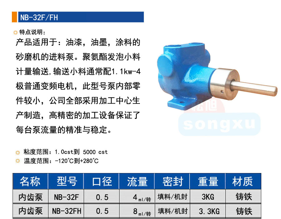 产品适用于:油漆,油墨,涂料的 砂磨机的进料泵。聚氨酯发泡小料 计量输送,输送小料通常配1.1kw-4 极普通变频电机,此型号泵内部零 件较小,公司全部采用加工中心生 产制造,高精密的加工设备保证了 每台泵流量的精准与稳定。