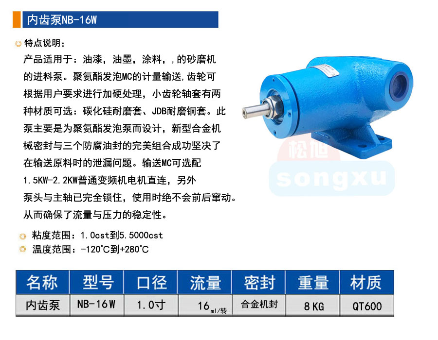 产品适用于:油漆,油墨,涂料,,的砂磨机的进料泵。聚氨酯发泡MC的计量输送,齿轮可根据用户要求进行加硬处理,小齿轮轴套有两种材质可?。禾蓟枘湍ヌ?、JDB耐磨铜套。此泵主要是为聚氨酯发泡泵而设计,新型合金机械密封与三个防腐油封的完美组合成功坚决了在输送原料时的泄漏问题。输送MC可选配1.5KW-2.2KW普通变频机电机直连,另外泵头与主轴已完全锁住,使用时绝不会前后窜动。从而确保了流量与压力的稳定性