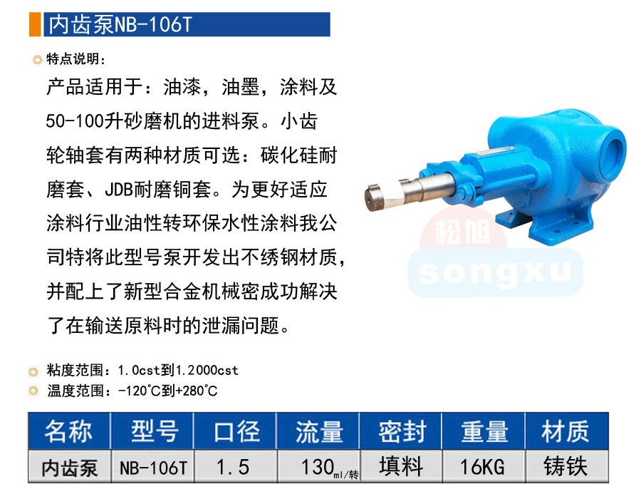 产品适用于:油漆,油墨,涂料及50-100升砂磨机的进料泵。小齿轮轴套有两种材质可选:碳化硅耐磨套、JDB耐磨铜套。为更好适应涂料行业油性转环保水性涂料我公司特将此型号泵开发出不绣钢材质,并配上了新型合金机械密成功解决了在输送原料时的泄漏问题。
